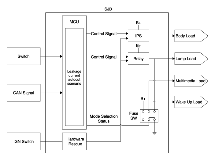The smart junction box controls the power distribute, dark current cut system, switch input, ESS control and hazard lamp as below diagram.